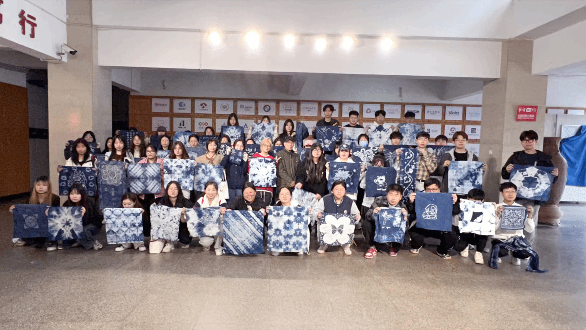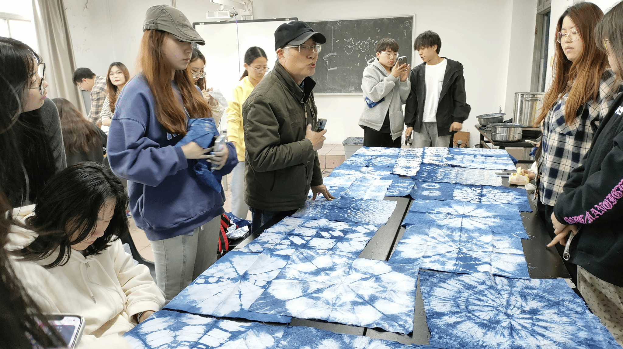 在工作坊课程实施过程中,首先进行手工扎染的教学,龚老师从扎花的捆扎法、缝绞法、夹扎法三个方法对织物进行扎、缝、缚、缀、夹等多种形式组合后进行染色。扎染技艺晕色丰富,变化自然,趣味无穷,更使人惊奇的是扎结每种花,即使有成千上万朵,染出后却不会有相同的出现,这种独特的艺术效果,是机械印染工艺难以达到的。在手工蜡染的教学中,使用蜡刀和毛笔综合应用,对蜡染图案进行表现,丰富图案的表现形式,在染料的选用上使用的传统蓝染染料,同学们在龚老师的带领下将自己设计的图案手工染制,将一幅幅作品呈现出来,在染制的过程中充满快乐的惊喜,同学们沉浸在手工印染的乐趣之中。