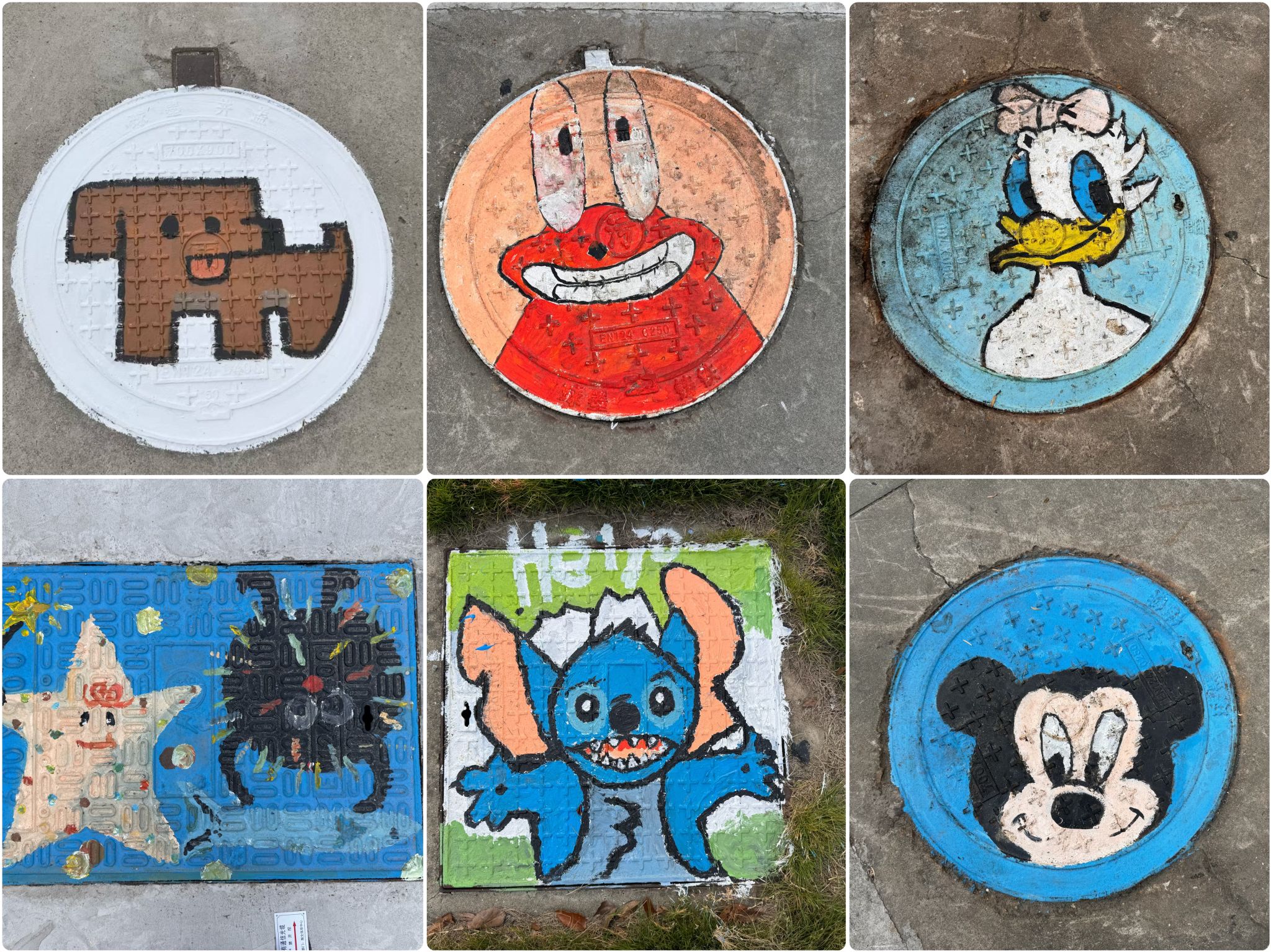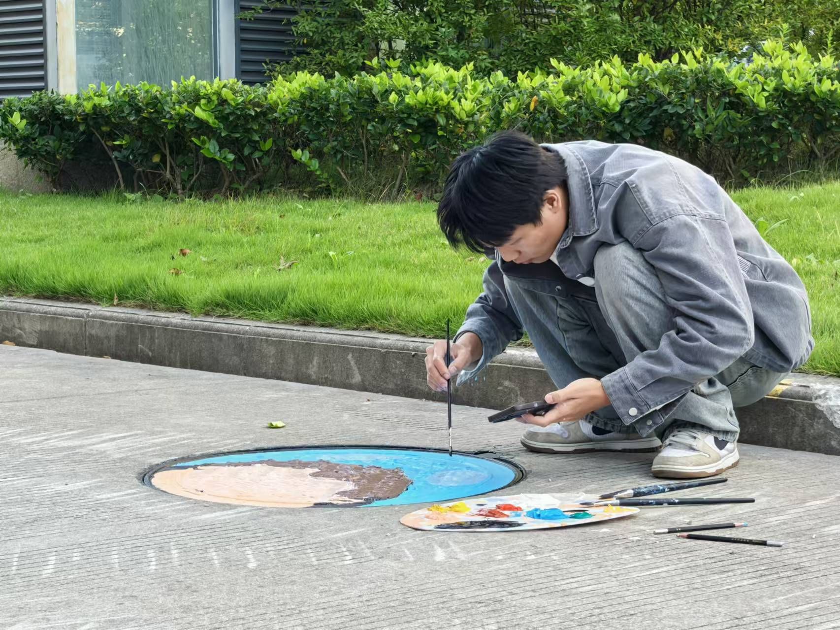 活动现场,五彩斑斓的颜料与各式各样的画笔在参与者手中灵活舞动,编织出一幅幅生动而富有创意的画面。学生们以宿舍楼前平凡的井盖为创作舞台,运用各自的专业知识与无限想象,将原本默默无闻、缺乏生气的井盖彻底改头换面,这些不起眼的井盖在大家的巧手下,化身为校园内一道道引人注目的艺术风景。