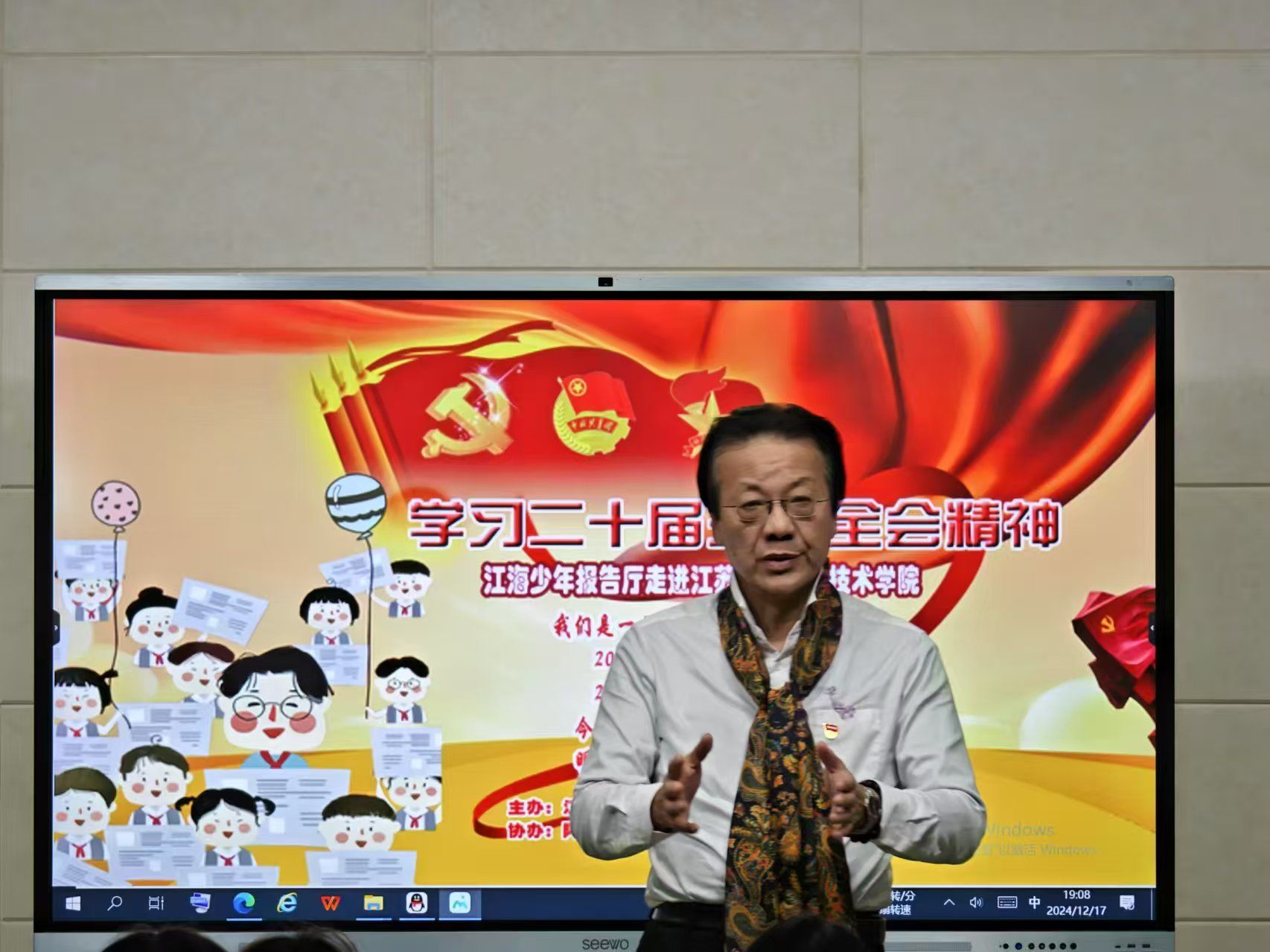 12月17日晚,艺术设计学院邀请江海少年通讯社•江海少年报告厅的少先队员走进我校,开展学习党的二十届三中全会精神教育宣讲,大中小学生共同上了一节特殊的思政课。体验式教育专家、江苏少年儿童研究会社会教育专业委员会副主任朱涌,艺术设计学院党总支书记彭曼,学院团总支书记张晓霞、副书记王皓澄及100余名学生党员先锋工作站成员和新团员参加了活动。宣讲活动由江海少年通讯社陆以蒙担任主持人。