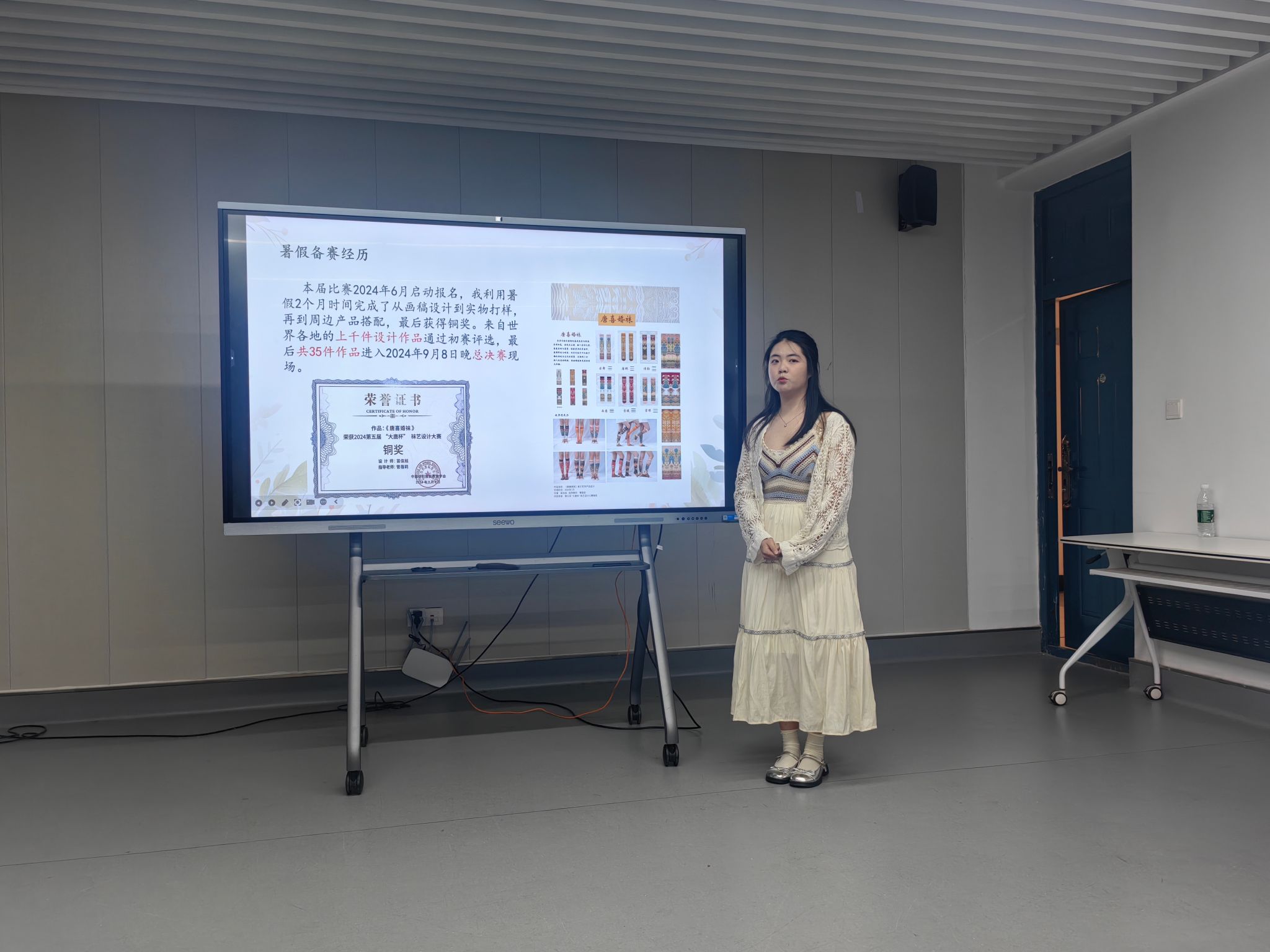 分享会现场气氛热烈,优秀学生代表们依次登场,分享成长故事与奋斗历程。首先,22家纺班刘蕾和22产品一、二班苗佳旭结合自身经历,讲述了专转本过程中的规划与坚持,为有学历提升想法的同学提供了实用建议,强调了明确目标与不懈努力的重要性,鼓励同学们勇敢追梦。接着22艺术设计一班张旭阳和22艺术设计三班蒋宇晴和同学们分享了在学业与实践上的心得,指出学习阶段要着力搭建知识体系,既需广泛阅读专业书籍以拓宽知识边界,又要深入剖析典型案例汲取成败经验;在实践领域要主动参与各类活动,把课堂知识巧妙融入其中,于实践中提升沟通协作与应变能力。最后,2025年江苏省职业技能大赛视觉传达设计赛项一等奖得主户金莹、周丽雅、江瑾涵讲述了备赛过程中的策略规划、技能提升方法以及比赛现场的应对技巧,并分享了独特的设计理念与创作心得,为同学们拓宽了设计视野,启迪了创新思维。