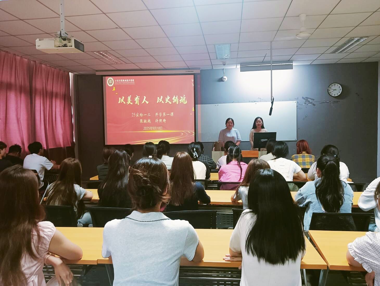 为加强班风学风建设,创新班级管理与思想引领的有效路径,9月18日,艺术设计学院25家纺一二班在致知楼209成功举办了“以美育人,以史铸魂”主题班会。本次班会创新性地采用“双师同堂”模式,由辅导员兼班主任的许照绮与马克思主义学院思政课教师张驰越联袂主讲,旨在探索协同育人的新路径。