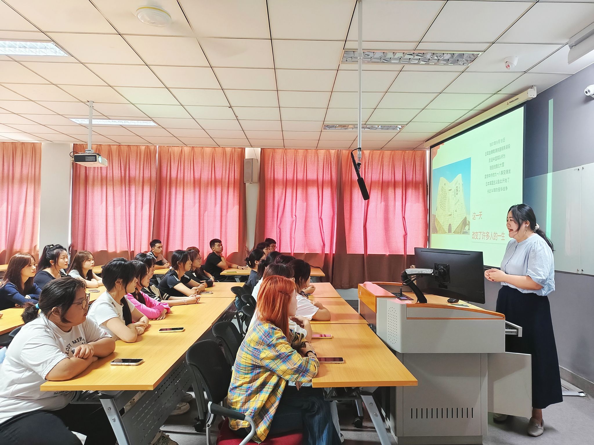 班会课上,两位老师从不同维度对主题进行了深刻阐释。许照绮从辅导员的日常管理和学生的专业发展角度出发,阐述了班级建设中“美育”的重要性。她希望通过此次班会,引导同学们将对美的追求内化为班级建设的向心力,外化为服务社会的责任感。随后,张驰越则以“九一八”为切入点,通过讲述钱伟长先生的爱国事迹,为同学们注入了“史魂”的强大精神力量,实现了育人目标上的同频共振。