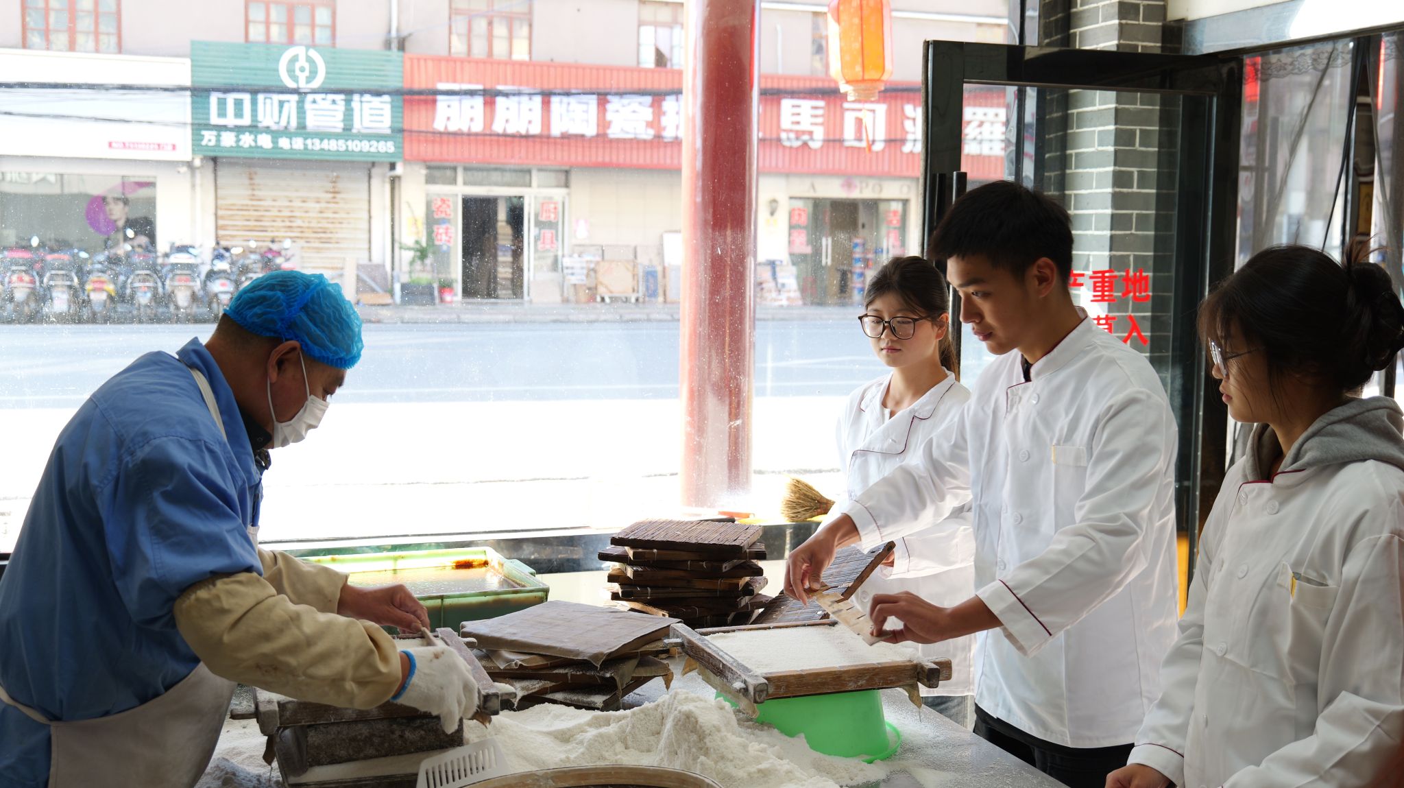 在石港窨糕非遗工坊,传承人张建华手持木模,向师生们展示窨糕制作技艺。从选料、浸米、磨粉到筛粉、压模、蒸制,每一道工序都蕴含着匠人的智慧。“窨糕的精髓在于三蒸三晾,既要保证口感软糯,又要让米香层层渗透。”张老师边操作边讲解,师生们围在操作台前,认真记录每个细节。在张老师手把手的指导下,大家尝试独立完成压模工序,当印有“福”“寿”字样的窨糕在蒸笼中渐渐成型,现场响起阵阵惊叹。