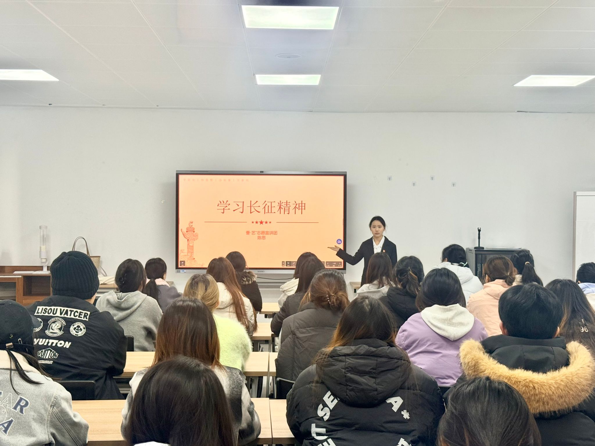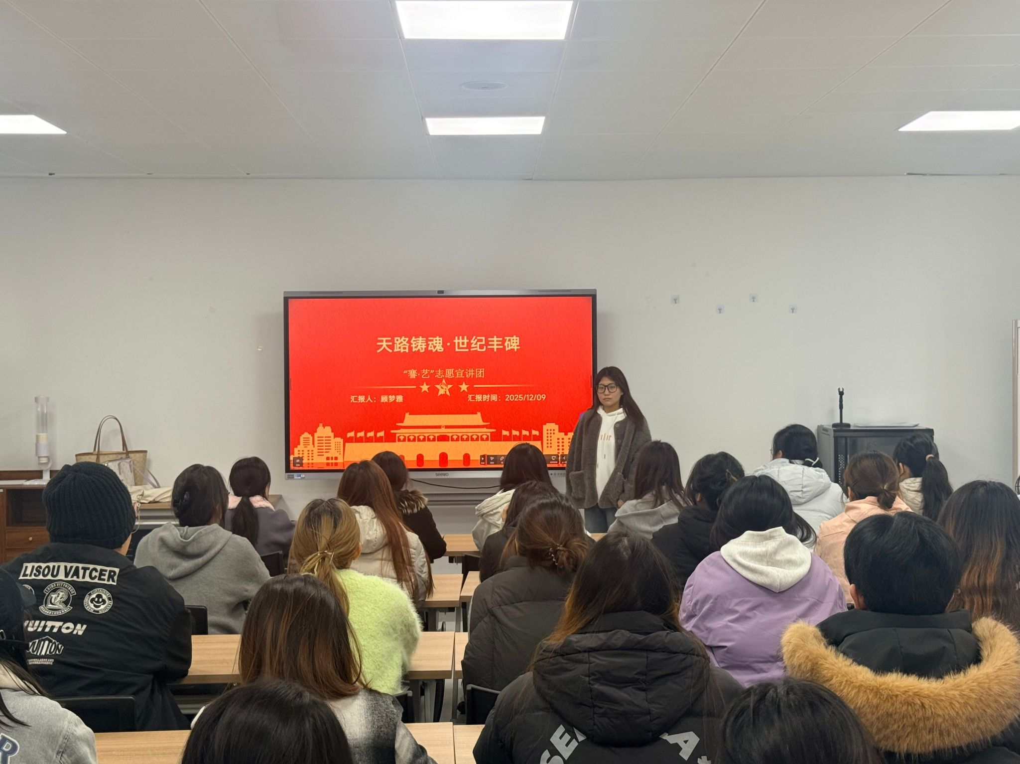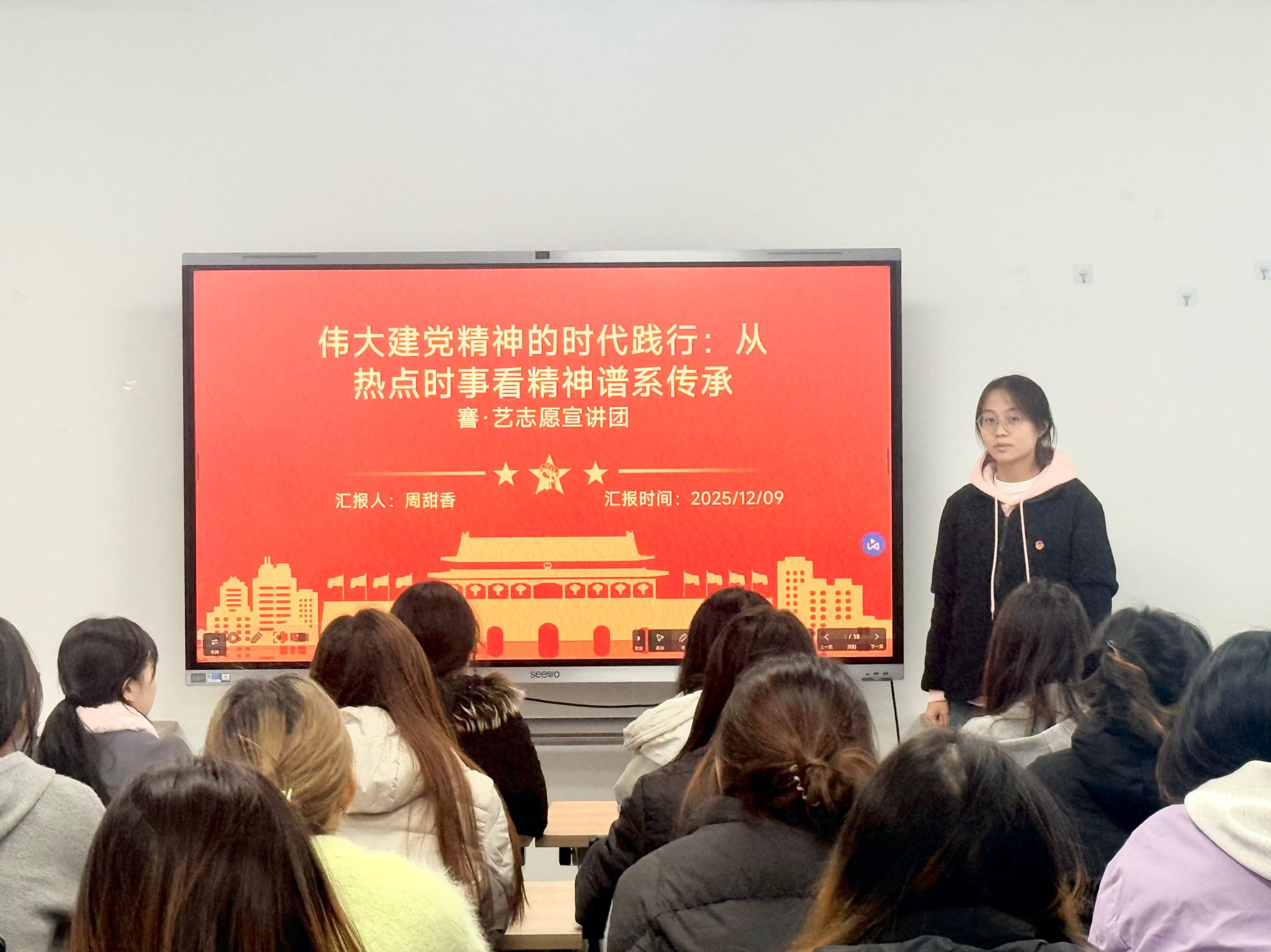宣讲现场,院“謇·艺”志愿宣讲服务团的三位学生宣讲员结合历史纵深与时代故事,进行了富有感染力的讲述。陈思以《长征精神》诠释了“革命理想高于天”的坚定信仰;周甜香通过《伟大建党精神的时代践行》,展现该精神在脱贫攻坚、科技创新等实践中的传承;顾梦雅借《青藏铁路精神》,再现“挑战极限,勇创一流”的奋斗史诗。宣讲史料详实、逻辑清晰,以历史、理论与实践的有机统一,使精神谱系可亲可感,引发师生深切共鸣。