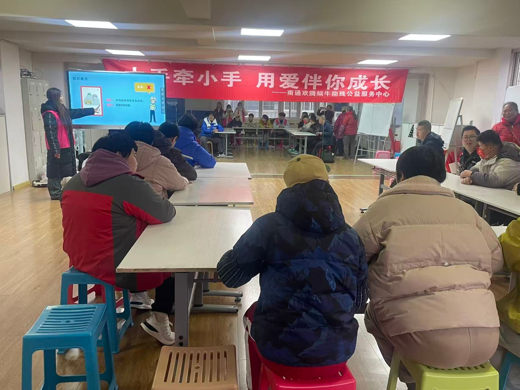 12月24日下午,数字与创意设计学院“謇·艺”志愿宣讲服务团走进南通市崇川区欢腾蜗牛助残公益服务中心,开展了一场别开生面的“小细节·大安全——遵守规则才安全”交通安全主题宣讲活动,为特殊群体孩童送去温暖与安全知识。