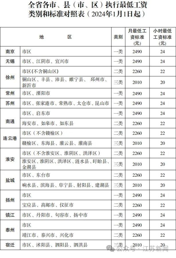 一、月最低工资标准:一类地区2490元;二类地区2260元;三类地区2010元。非全日制用工小时最低工资标准:一类地区24元;二类地区22元;三类地区20元。