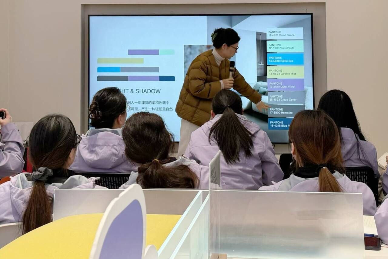 本次培训紧密围绕企业发展实际需求,聚焦家纺产品开发前沿趋势、现代家居生活体验方式创新以及产品色彩设计与竞争优势构建等核心议题展开。管蓓莉结合校企双方正在合作开发的新品项目,以丰富的专业知识和鲜活的案例,为企业核心设计与营销团队进行了深入浅出的讲解与交流。培训内容既有理论高度,又极具实践指导性,现场互动热烈,获得了企业人员的高度认可。“友智友眠”公司负责人表示,此类“上门送教”的培训形式,直击企业创新发展中的知识痛点,为团队带来了新理念、新思路,有效助力了企业产品力与竞争力的提升。