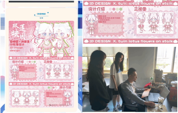 《作品》以圆明园历史底蕴为灵感,塑造“绣荷”“锦莲”并蒂莲姐妹IP。她在设计说明中写道:“月光夏夜,并蒂莲悄然绽放,花瓣柔光似唤醒园囿沉睡的灵魂。”诗意创意让传统文化焕发年轻活力。创作中,指导老师全程精准护航,从敲定“并蒂莲”文化符号,到优化姐妹IP的造型比例与色彩搭配,再到根据赛事标准打磨作品呈现细节,让“绣荷·锦莲”的形象既贴合圆明园文化气质,又具备现代IP的传播力与感染力。